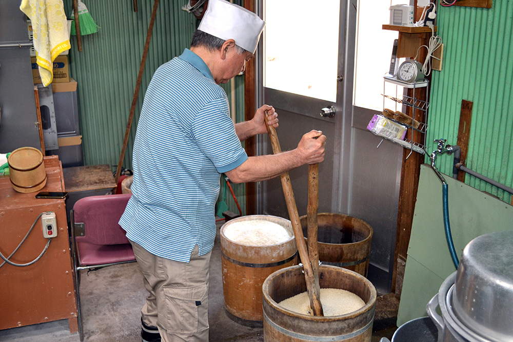 一度目の餅つきで、米団子を一つの大きなお餅にします。