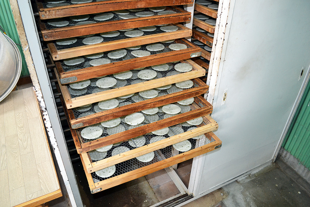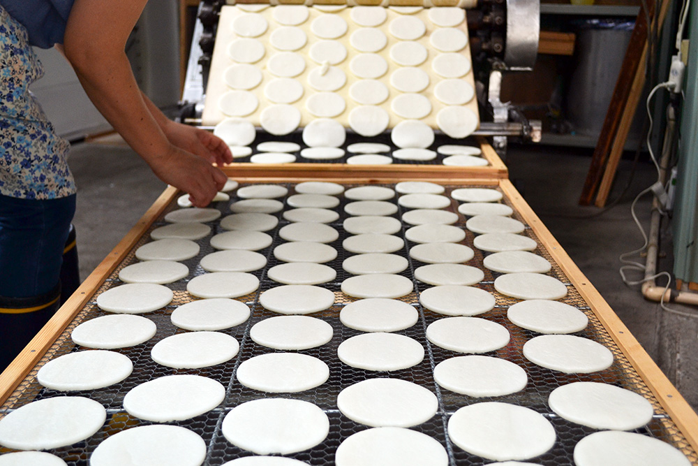伸ばしで薄く大きく伸びたお餅を、金属の金型を通過させることで、 丸い形の生地の原型を作り上げています。 型取りをしたばかりの生地は、まだ柔らかく、この状態でおせんべいにはなりません。